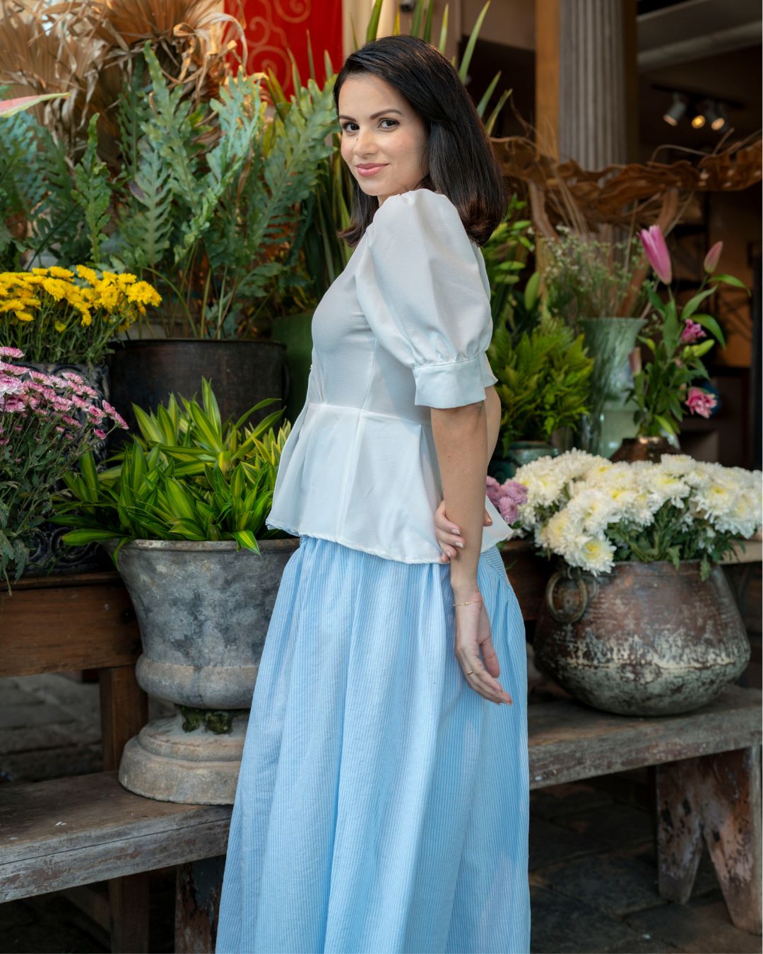 The Serina Top is designed to flatter with its gently shaped waist, delicate button detailing, and soft flowing hem. It creates a polished yet comfortable look — perfect for both everyday wear and slightly dressier moments.