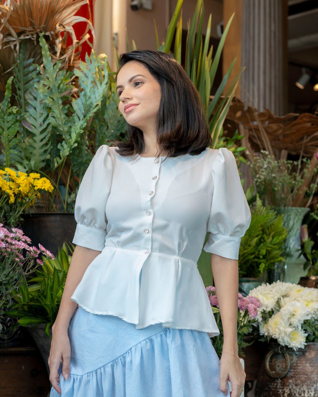 • Polyester material • Feminine peplum-style silhouette • Front button detailing for a classic touch • Structured waist for a flattering fit • Comfortable short sleeves • Easy to style with skirts, trousers, or denim • Available in multiple shades