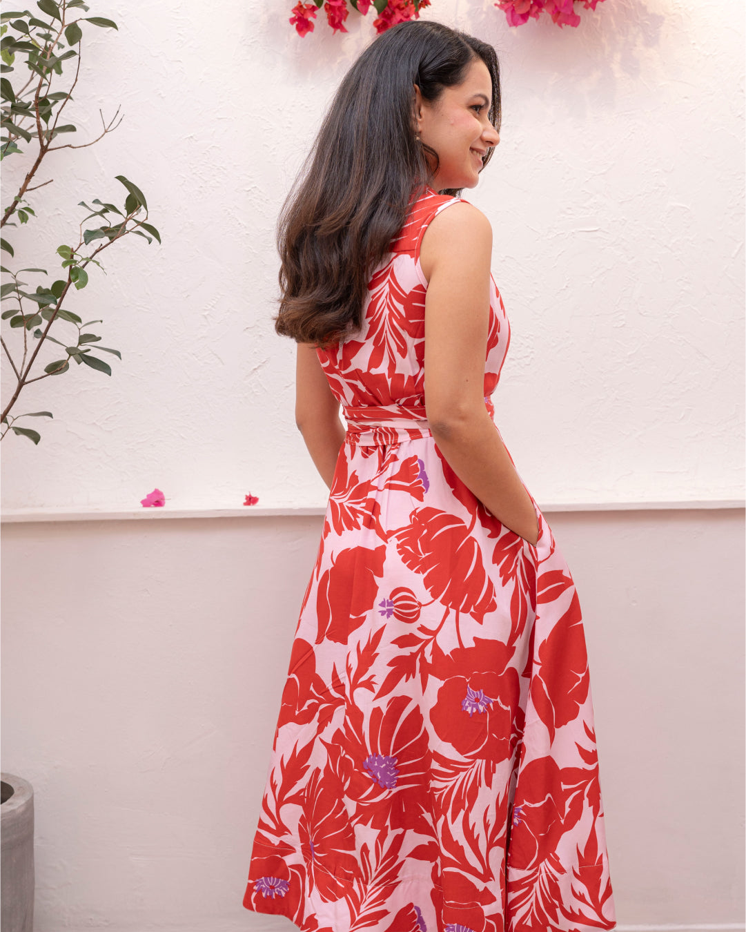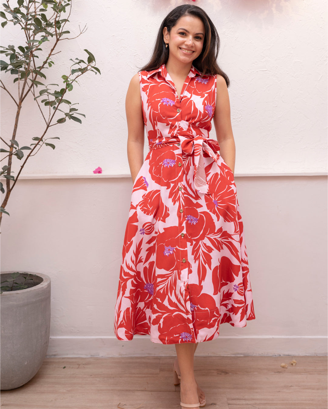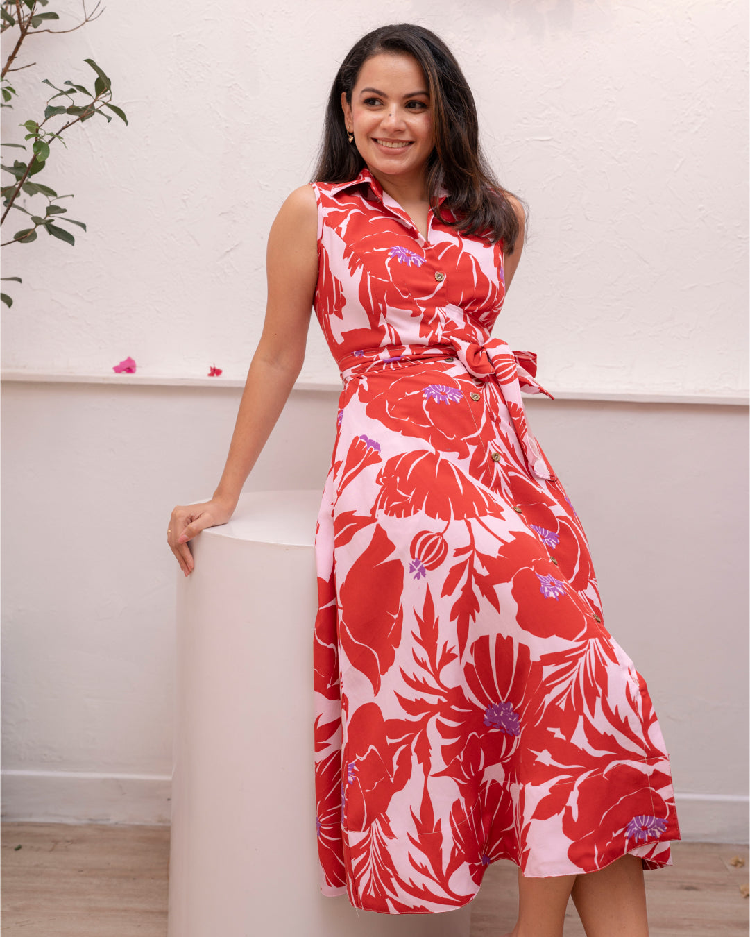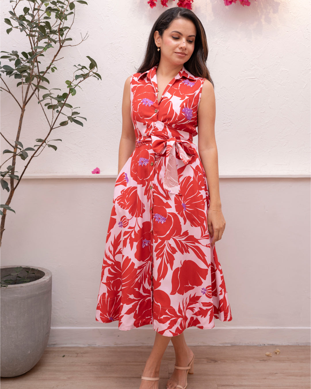 Bold, romantic, and effortlessly chic — the Venezia Dress is a celebration of Italian charm. Designed with a vibrant red-and-white floral print accented by hints of purple, it embodies the lively spirit of Venice in full bloom. The sleeveless collared neckline, button-down front, and waist-tie detail create a flattering silhouette that blends sophistication with playful femininity. Flowing gracefully at midi length, the Venezia Dress is perfect for both sunlit strolls and evening gatherings.