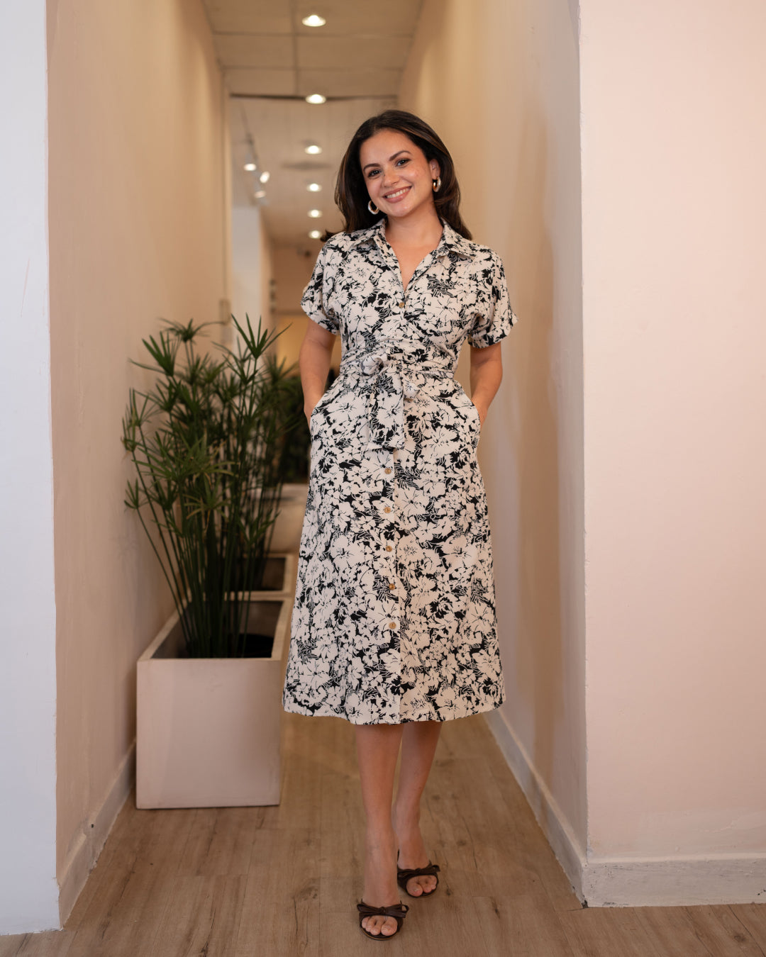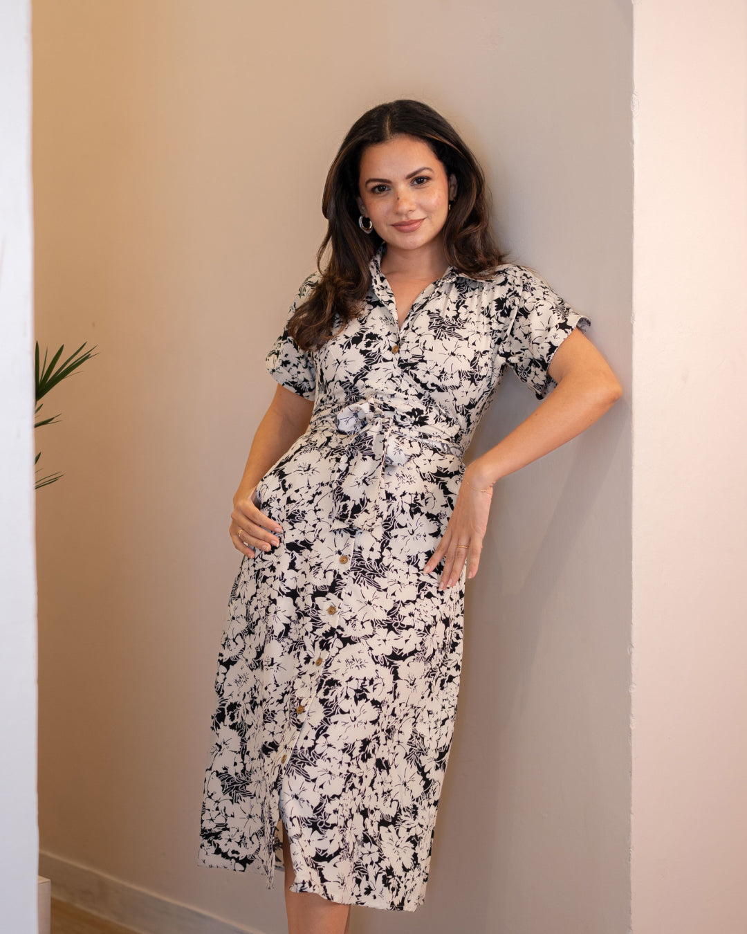 Meet your new go-to dress for any occasion. This versatile navy blue floral frock features a flattering tie-waist design, rolled sleeves, and a sleek knee length. Its lightweight fabric and classic blue hue make it a timeless staple in your wardrobe, perfect for casual outings, office party, or evening elegance.