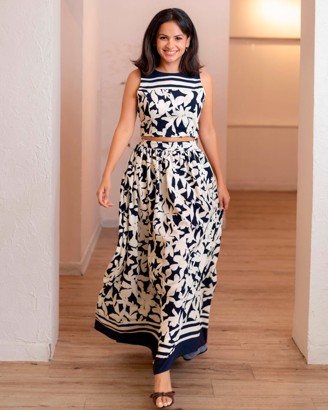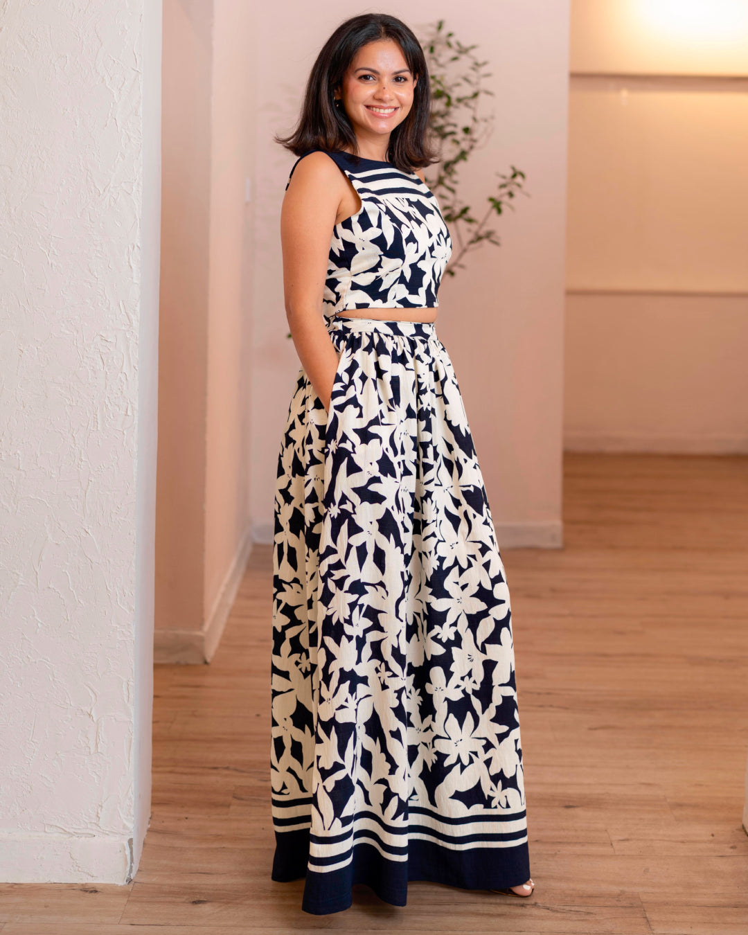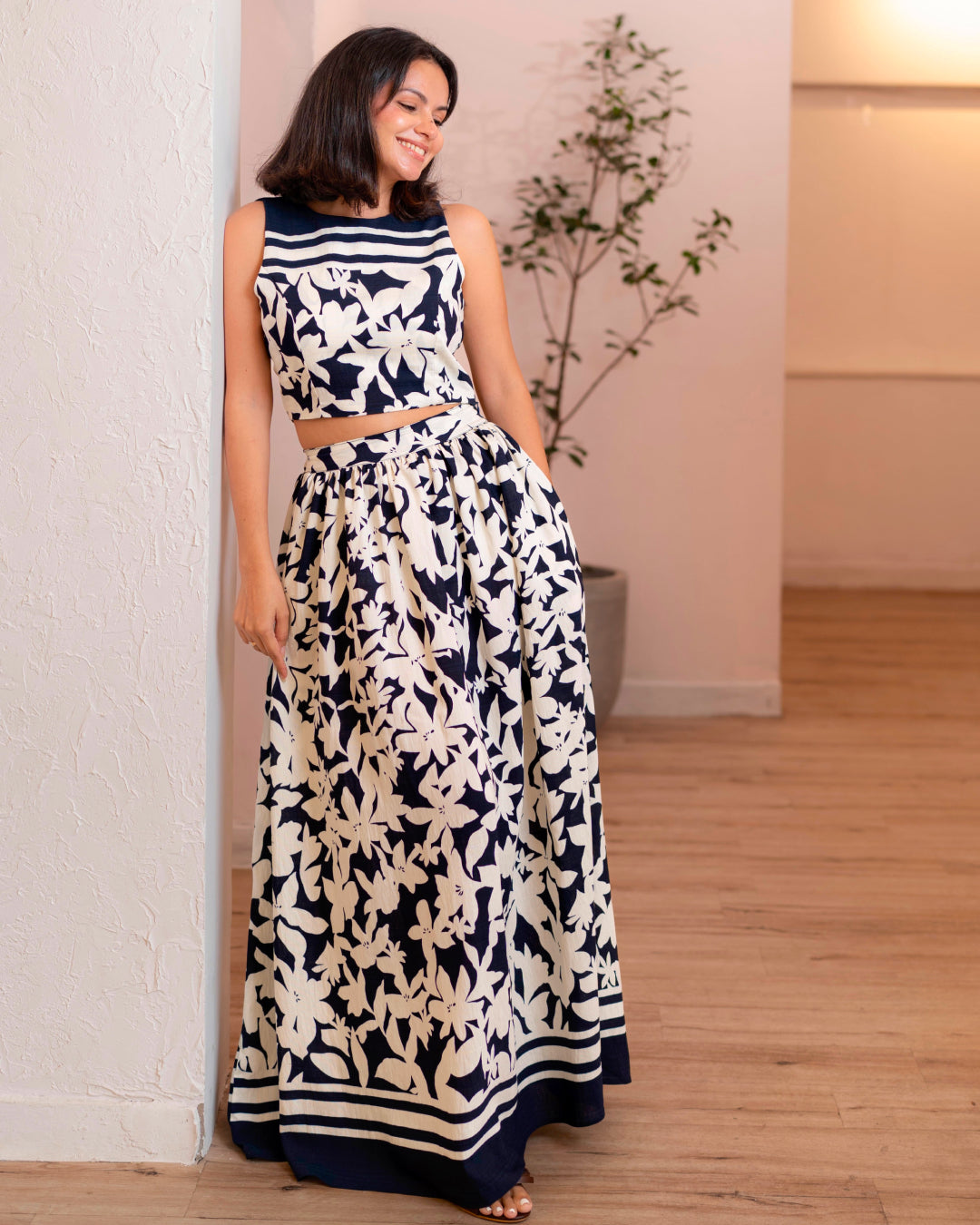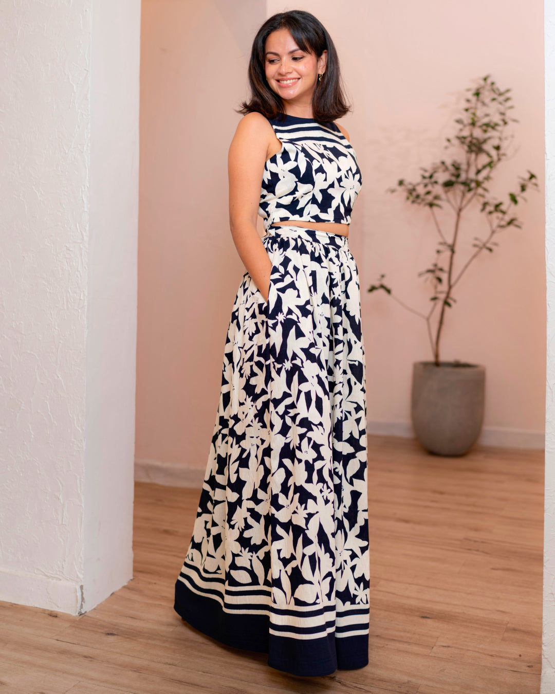 Step into effortless elegance with the Eden Bloom Set, a beautifully crafted two-piece that brings together bold florals, soft movement and refined charm. Designed in a striking navy-and-ivory palette, this set combines a flattering cropped top with a flowy, full-length skirt — creating a look that’s both modern and timeless.