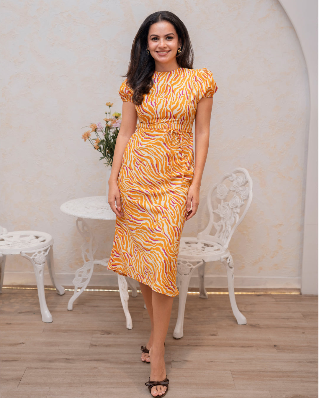The Sunset Wave Dress is where bold prints meet effortless elegance. Featuring an eye-catching zebra-inspired pattern in glowing shades of orange and pink, this midi is crafted with a flattering waistline and flowing silhouette. Perfect for cocktail evenings, brunches, or special outings, it’s a dress that captures attention and celebrates your fearless side.