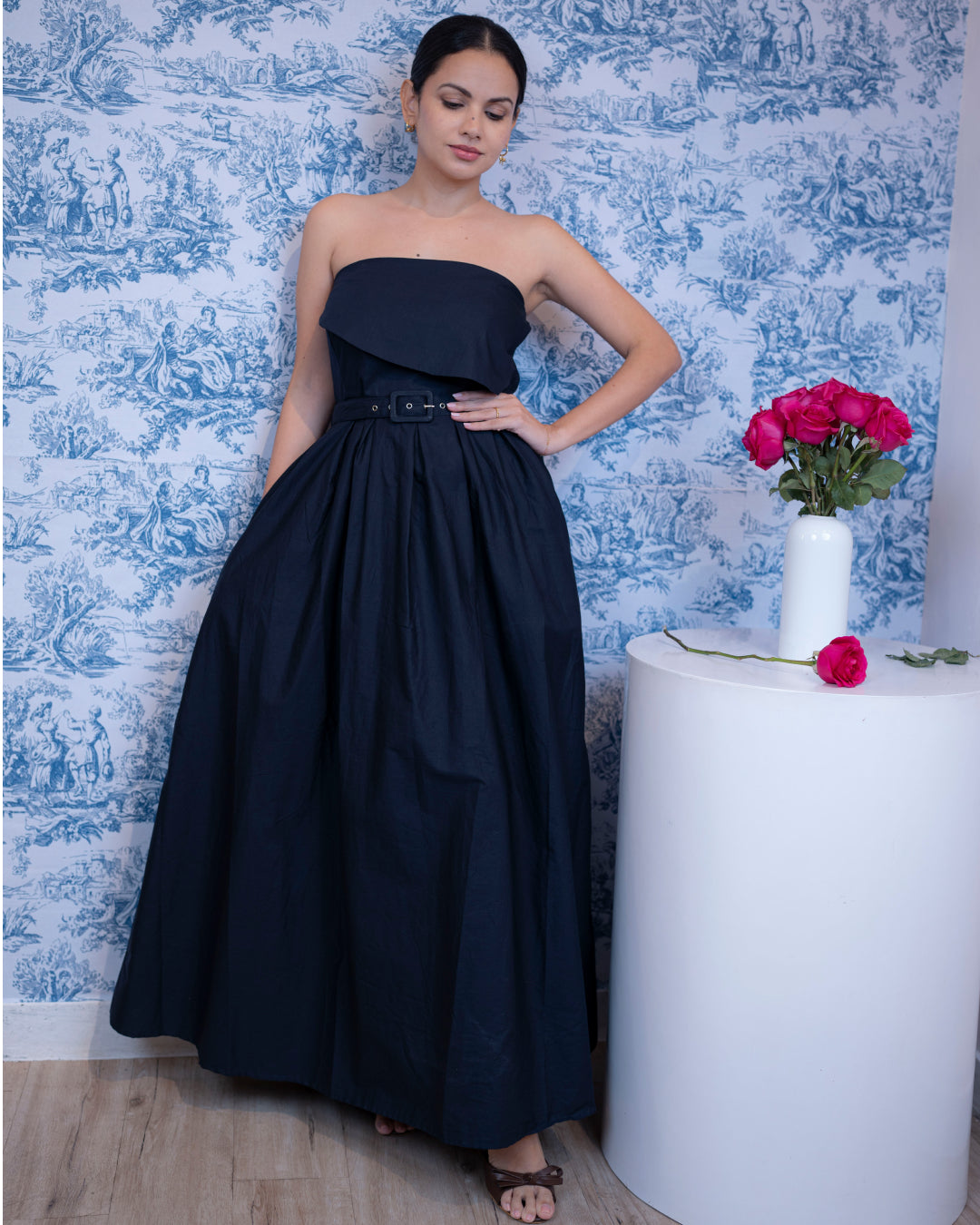 Sophisticated and striking, the Nightfall Dress is designed for moments that call for understated drama. Featuring a sleek strapless neckline and a softly structured bodice, this dress flows into a graceful, full midi skirt that moves beautifully with every step.