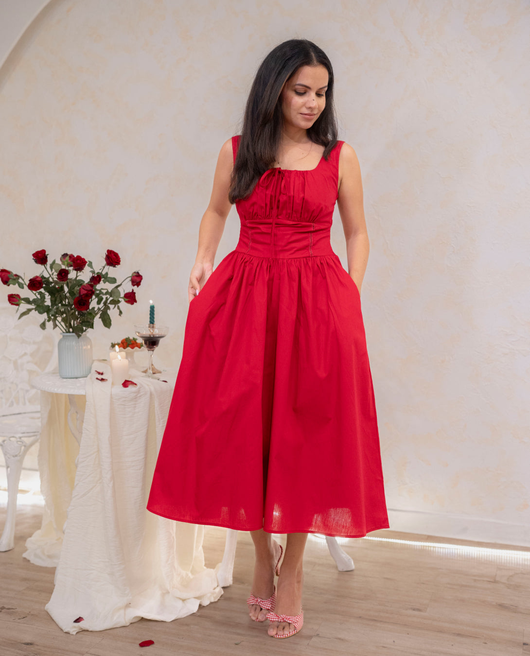 Bold, romantic, and unforgettable — the Valentina Dress is made for the woman who lights up every room she walks into. With its fitted bodice, flowing midi skirt, and vibrant red hue, Valentina is a celebration of passion and timeless elegance.