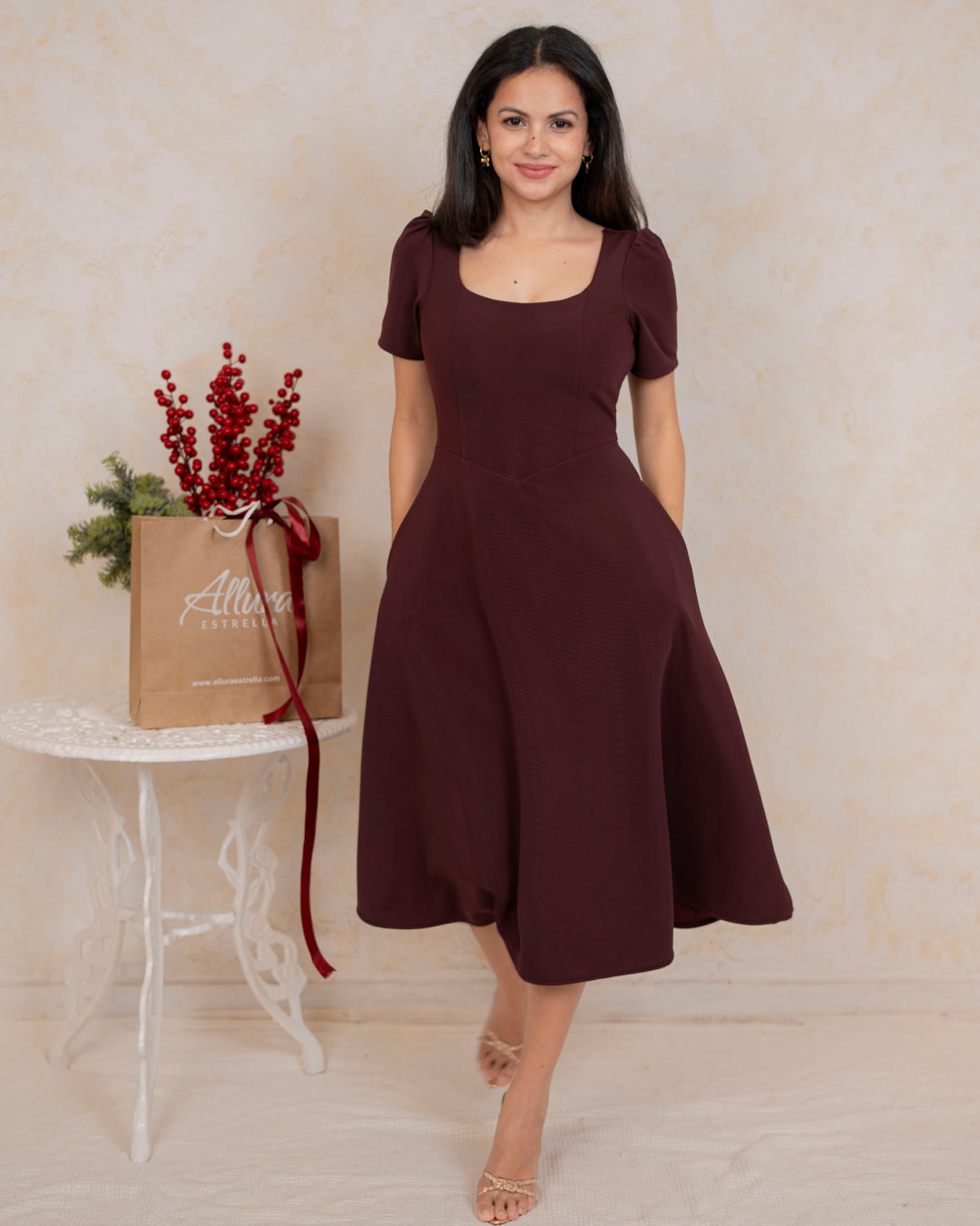 Crafted with a structured yet feminine fit, the Solara Dress features a flattering square neckline, soft sleeves, and a beautifully tailored waist that flows into a graceful midi-length skirt.