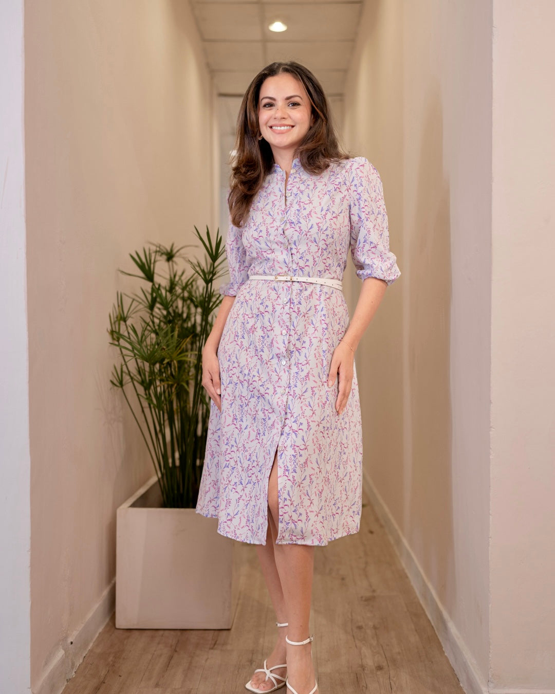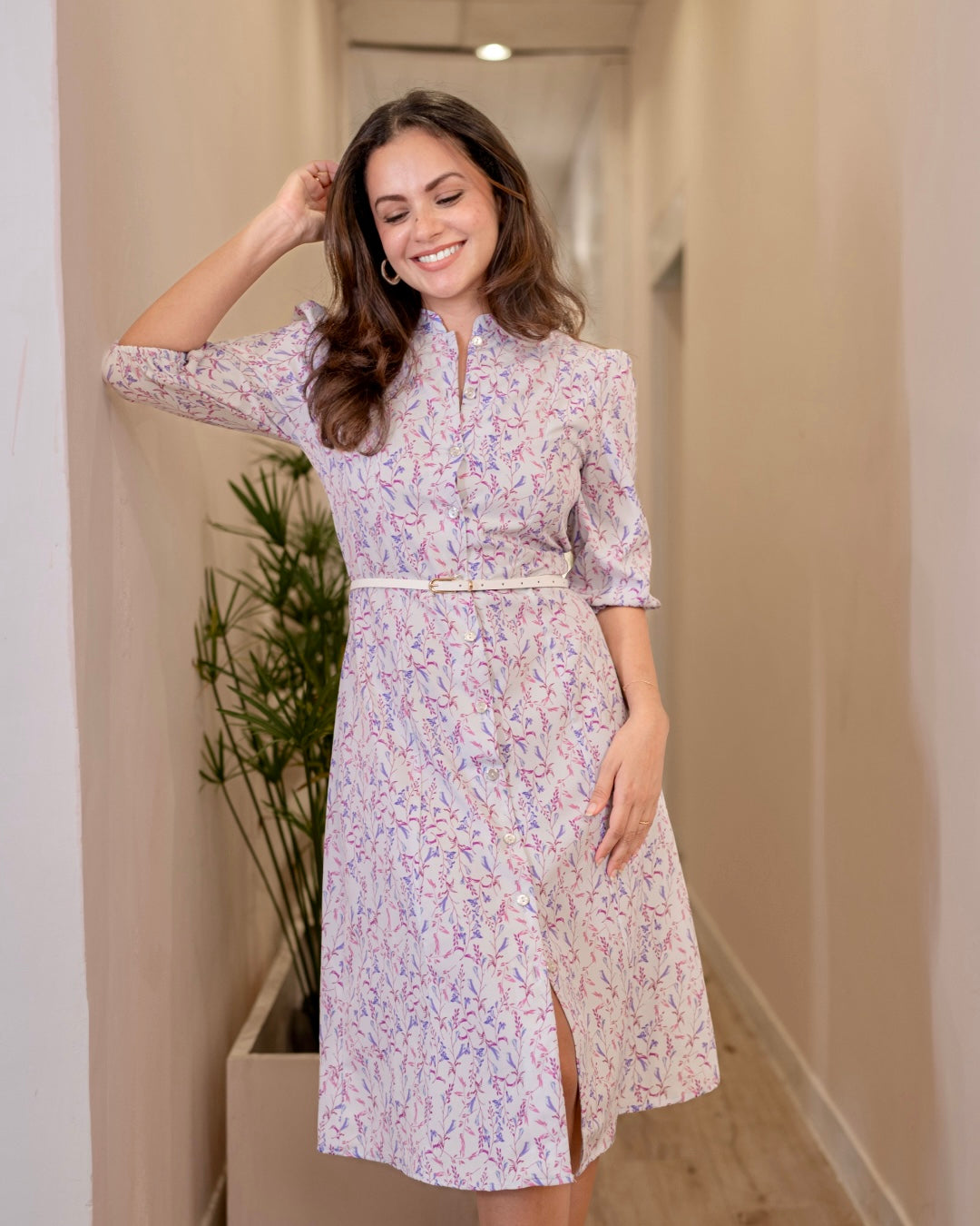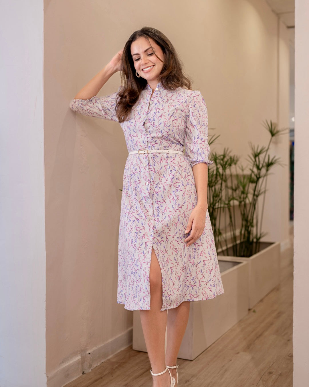 This light blue A-line dress is adorned with a soft floral print, bringing a fresh and feminine touch to your wardrobe. Designed with medium-length sleeves and delicate front buttons, it offers the perfect balance of style and comfort for any day out.